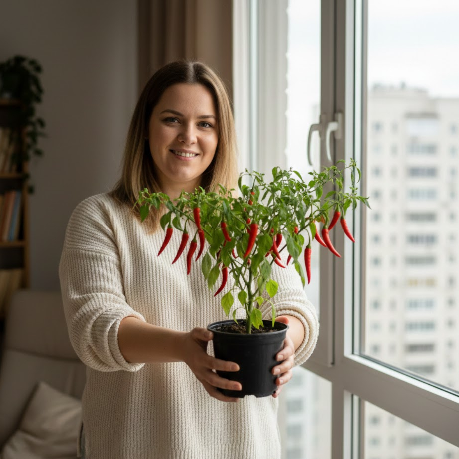 Горщик розрахований на повний цикл вирощування: перець росте і плодоносить прямо в ньому, без пересадок. Це зручно для домашніх умов і підходить навіть тим, хто не має досвіду вирощування рослин.