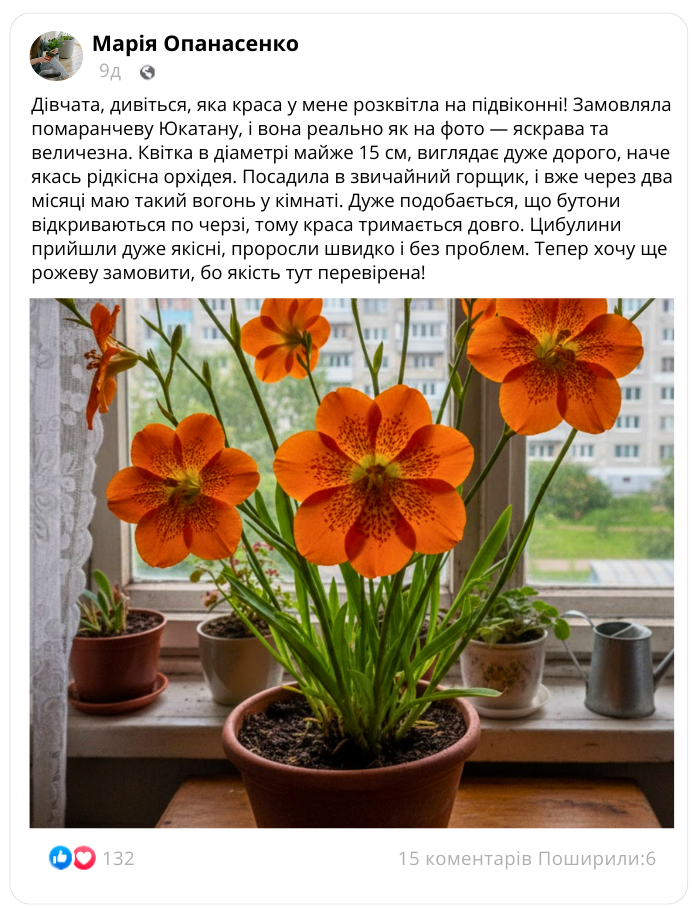 Сорт Юкатана — досконалість у кожній деталі. Це преміальна селекція кімнатної тігрідії, адаптована для життя на сонячних підвіконнях та терасах. Квітки гігантського розміру до 15 см мають насичений вогняно-помаранчевий колір із контрастним теракотовим крапом у центрі. Міцні квітконіс висотою 40–50 см не потребують опори та гармонійно виглядають у керамічних кашпо. Ми пропонуємо добірні цибулини калібру 7/9 з високою енергією проростання, що гарантує швидкий розвиток та розквіт уже в перший сезон. Юкатана відрізняється послідовним розкриттям бутонів, що забезпечує тривалу присутність яскравої екзотики у вашому інтер'єрі.