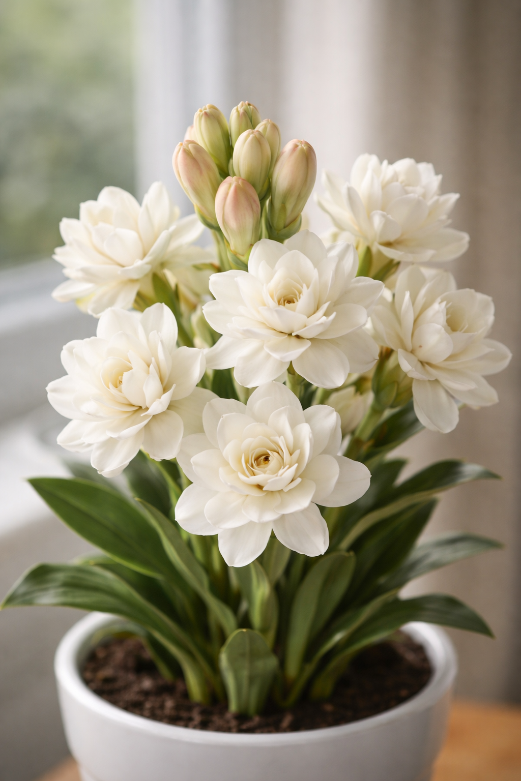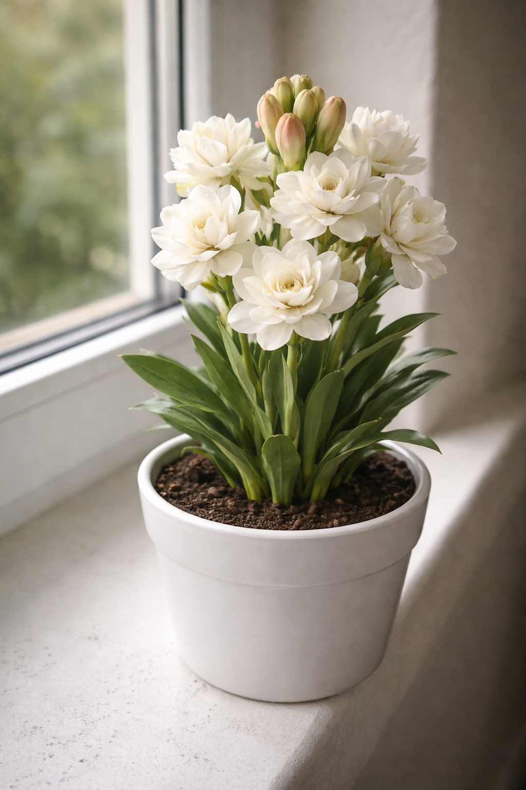 Тубероза (Polianthes tuberosa) — це багаторічна ароматна рослина, яку вирощують і в домі, і у відкритому ґрунті. Вона росте з цибулини, формує щільний кущ і випускає квітконоси з білими восковими квітами. У кімнатних умовах добре почувається на підвіконні, не потребує теплиці чи складних умов.