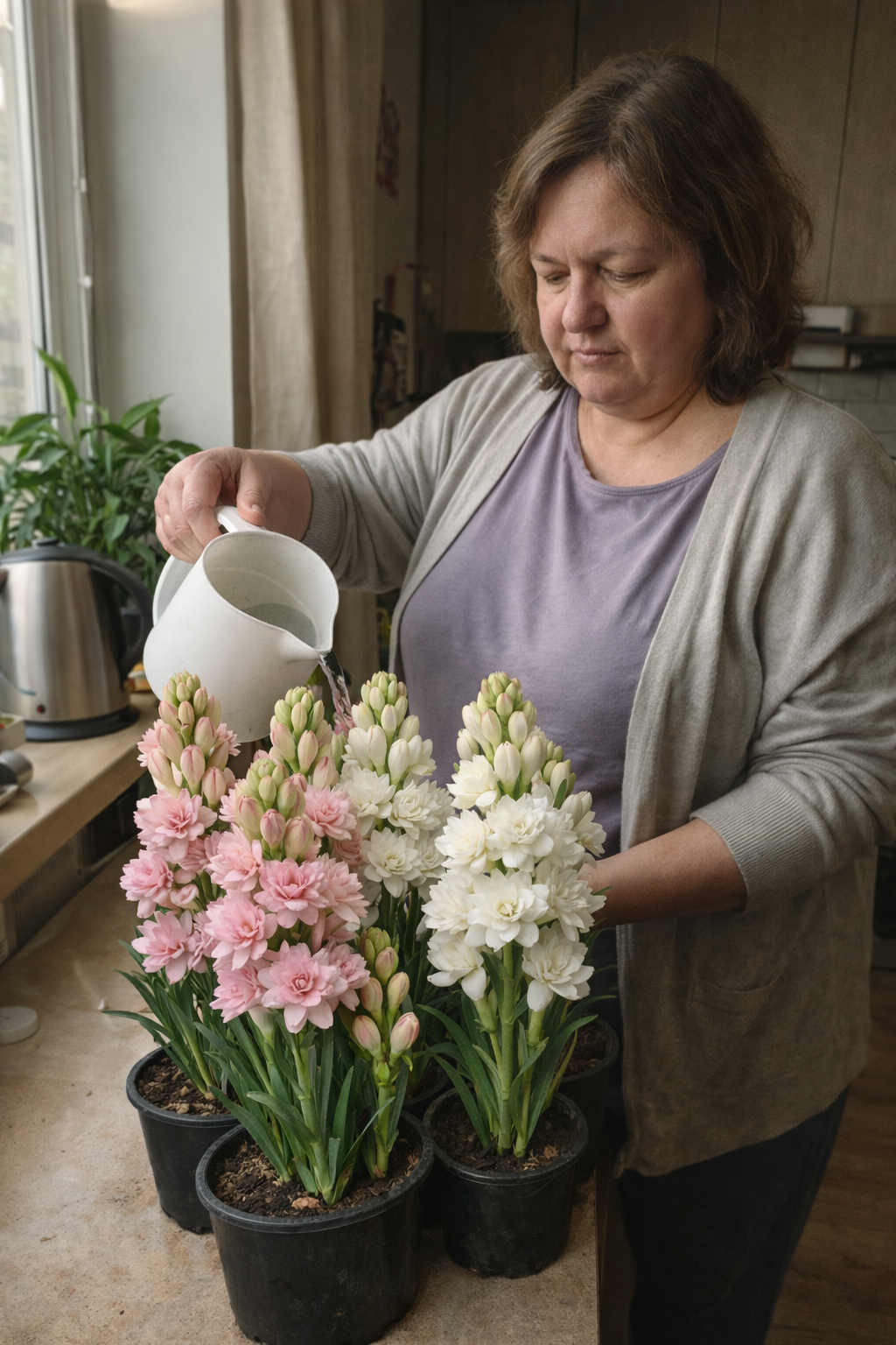Після посадки важливо не заливати водою — тубероза цього не любить. Поливати потрібно тоді, коли верхній шар ґрунту підсох. Температура — звичайна кімнатна, без протягів. За таких умов рослина швидко приживається і починає активно рости, а цвітіння з’являється вже через кілька тижнів.