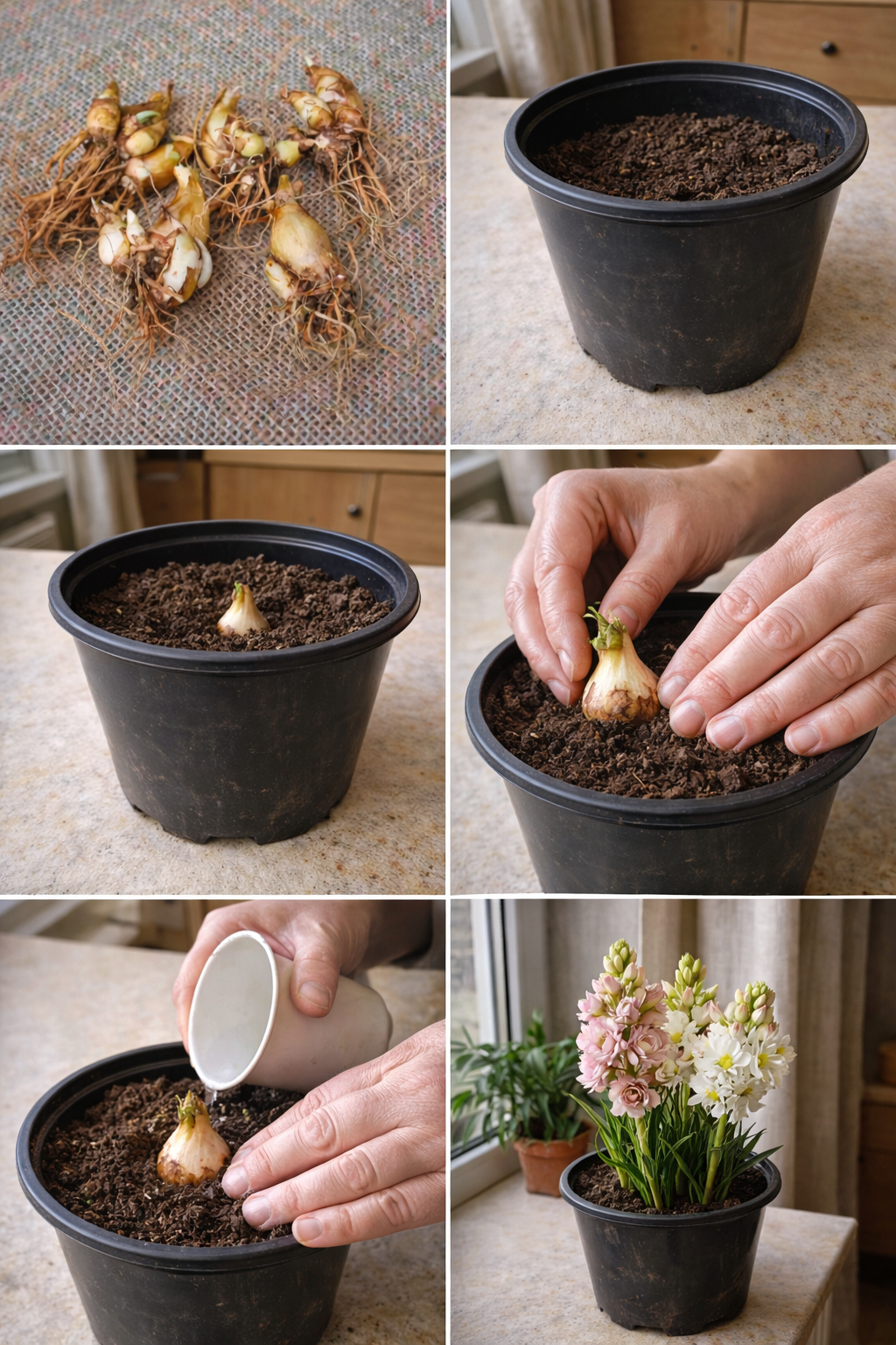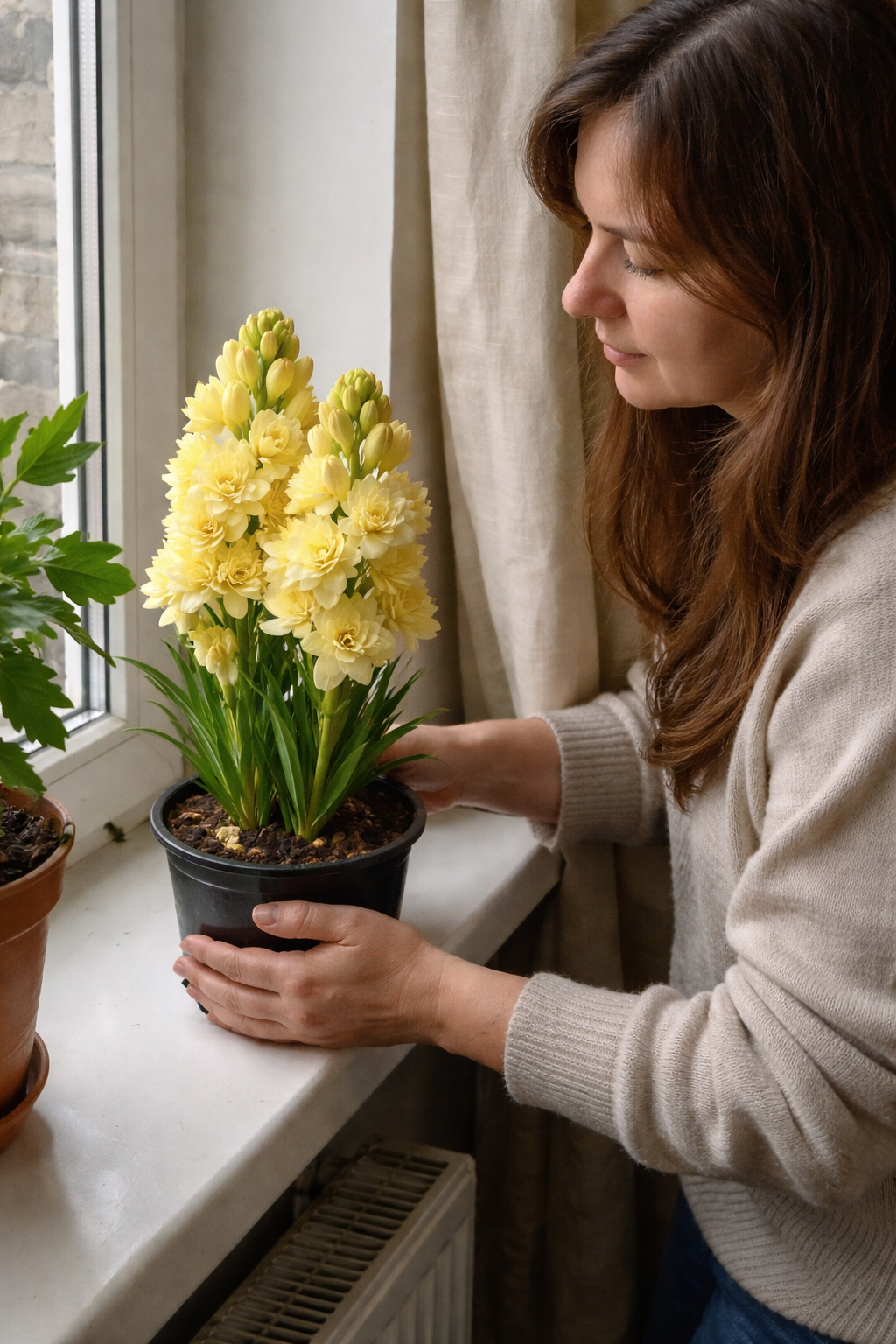 Для посадки туберози підійде звичайний горщик з отворами і легкий поживний ґрунт. Цибулину садять так, щоб верхня частина залишалась над поверхнею ґрунту — не закопувати повністю. Після посадки ґрунт злегка ущільнюють і поливають помірно, без переливу. Горщик ставлять у світле місце, бажано на підвіконня.